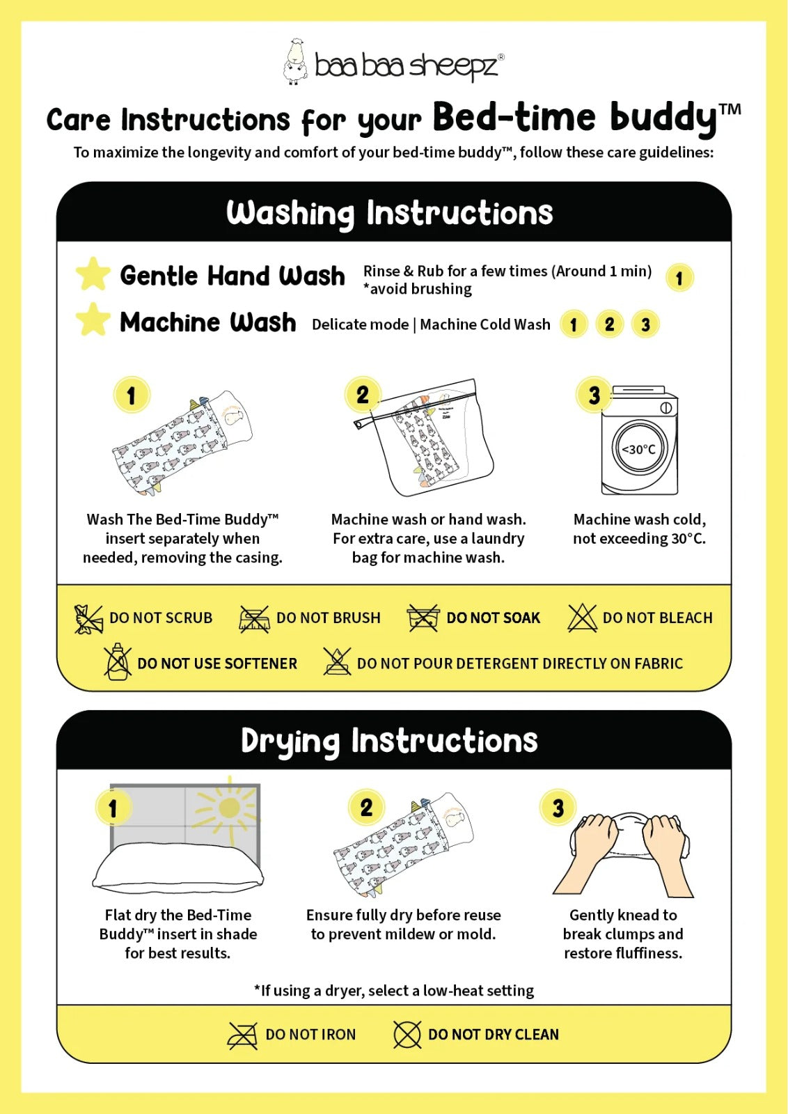 These instructions provide clear guidance for washing and drying The Bed-Time Buddy™, ensuring proper care and maintenance to extend its lifespan and comfort